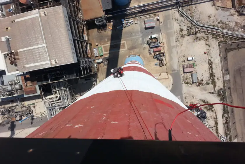 Intervention sur corde pour notre technicien en charge du contrôle d’une cheminée sur site industriel.