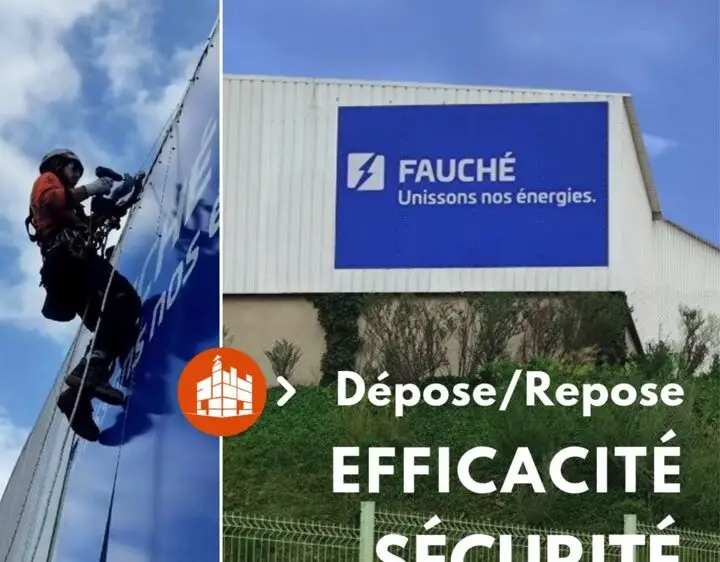 Suite à la mise en place de systèmes de sécurité conformes aux procédures et un balisage pour assurer la sécurité de tous, nos techniciens cordistes ont posé 2 nouveaux panneaux constituant l’enseigne Fauché.