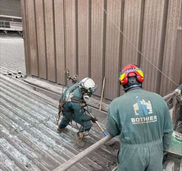 La suite des travaux que nos techniciens cordistes effectueront comprend le nettoyage par zones de la toiture, puis le remplacement des tôles existantes par des bardages neufs.