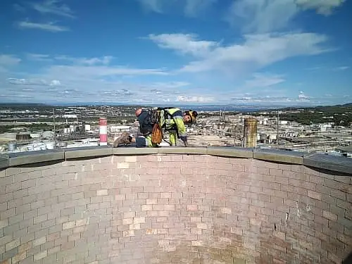 Travaux en grande hauteur pour notre équipe de cordistes de Marseille dans la prise de mesure au sommet d’une cheminée de 100 mètres en milieu industriel....