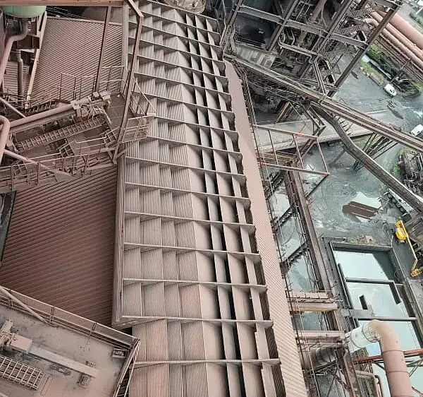 Intervention en milieu industriel près de Fos-sur-Mer, non loin de Marseille pour des travaux en hauteur (44 mètres) de recouvrement de la zone centrale de l’aérateur du haut fourneau. Installation de plaques d’aciers fixées avec cloueur spitfire et visseuse à percussion pour auto-foreuses....