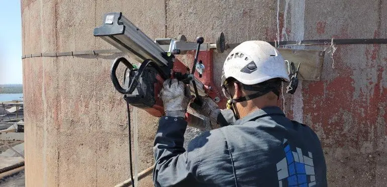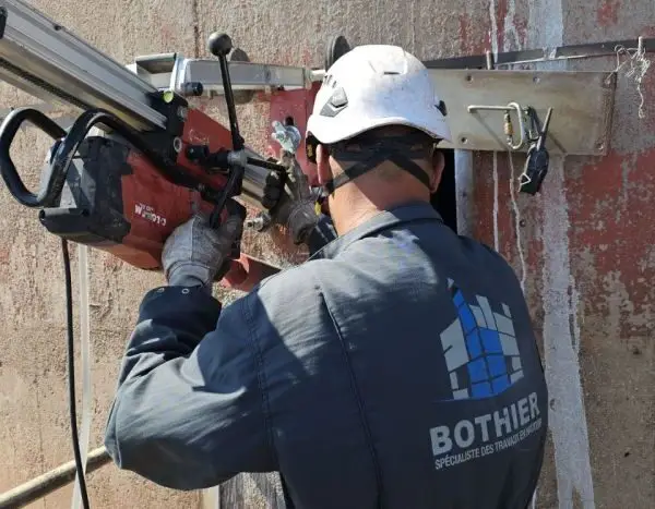 Nous sommes intervenus il y a quelques semaines sur un site industriel des Bouches-du-Rhône afin de procéder au carottage de plusieurs trous de différents diamètres. Ce carottage sur la cheminée du site industriel visait à la mise en place de fourreaux inox.