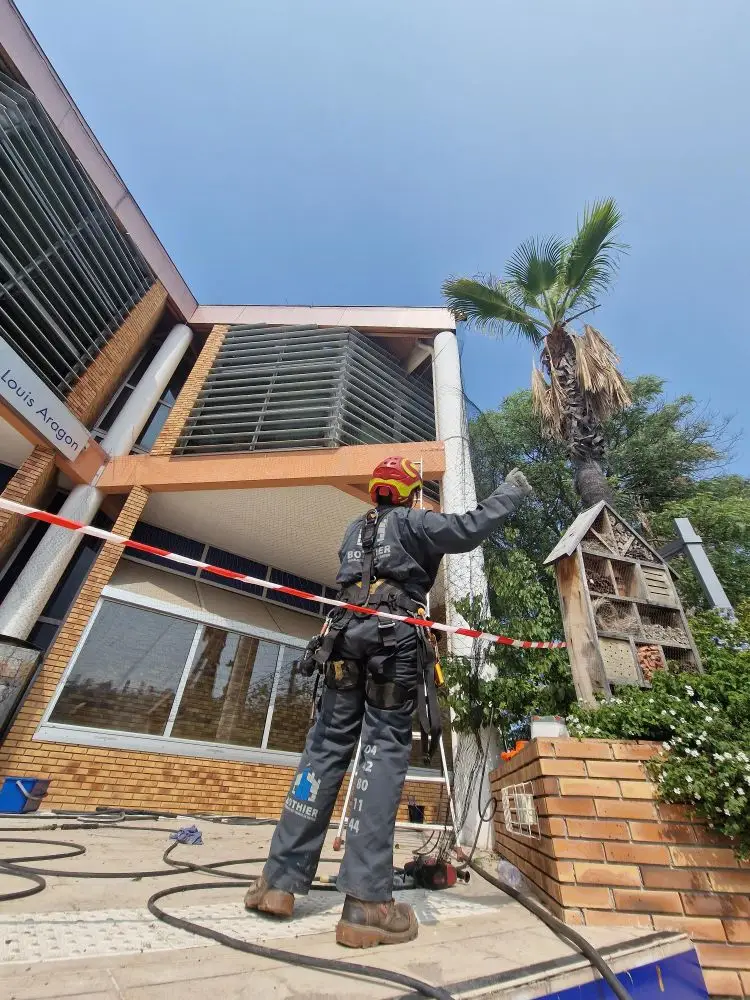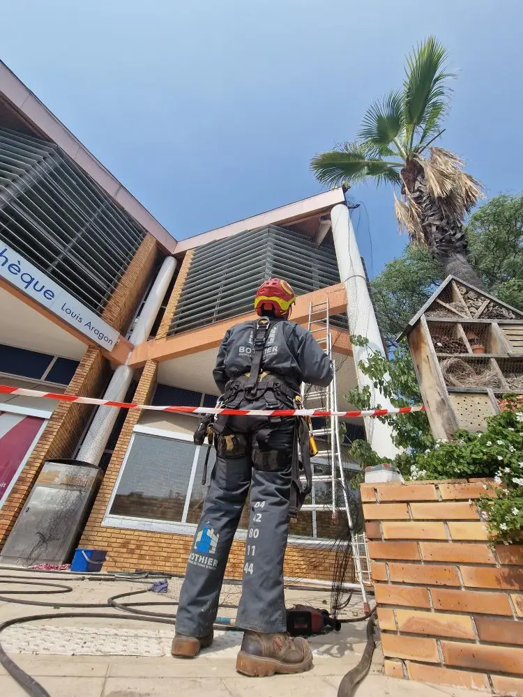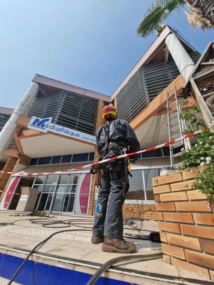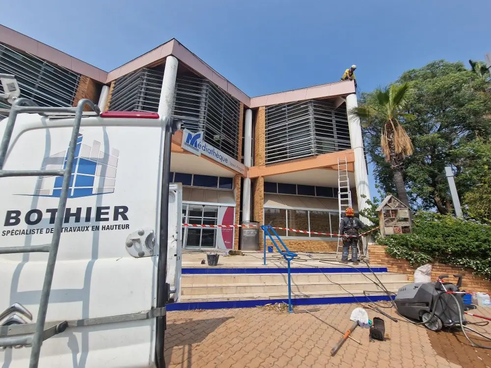 Pour le compte de la municipalité martégale, nous sommes intervenus il y a quelque temps sur la médiathèque Louis Aragon. Le but final de l’opération était la pose d’un filet anti-volatiles. Nous avons préalablement procédé au nettoyage de la façade avec un jet haute pression afin d’éliminer les fientes de pigeons et des autres oiseaux.