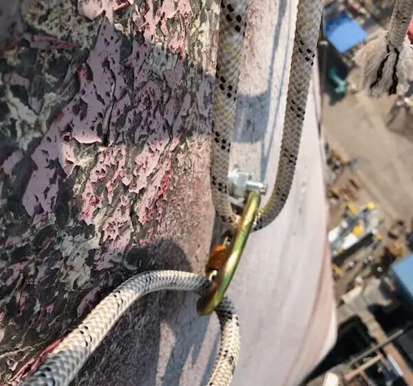 Trois techniciens cordistes sont descendus à l’intérieur de la cheminée en conditions relevant de la Sous-Section 4 Amiante (SS4), avec une vacation de 3 x 2 heures. Ils ont procédé à l’inspection et au relevé des désordres de l’état du réfractaire. Une vigie au sol en liaison radio, ainsi qu’un manutentionnaire qui avait pour tâche d’alimenter ses collègues en matériaux et outillage venaient compléter l’équipe.