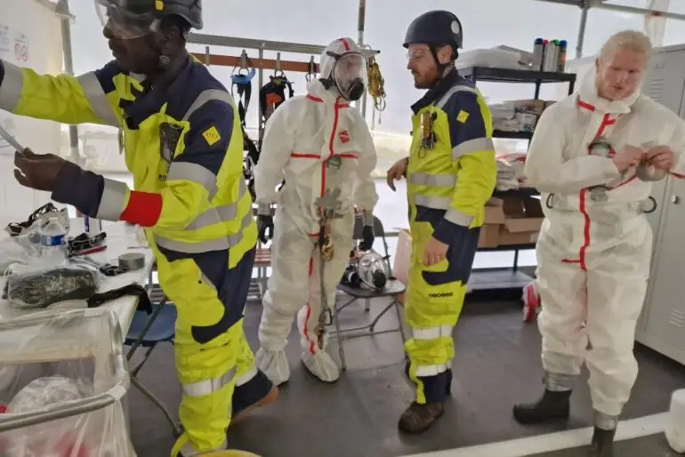 Leur mission, puisqu’ils l’ont acceptée, consistait en la pose de filets et de lignes de vie à l’intérieur d’une capacité, plus précisément un immense four.