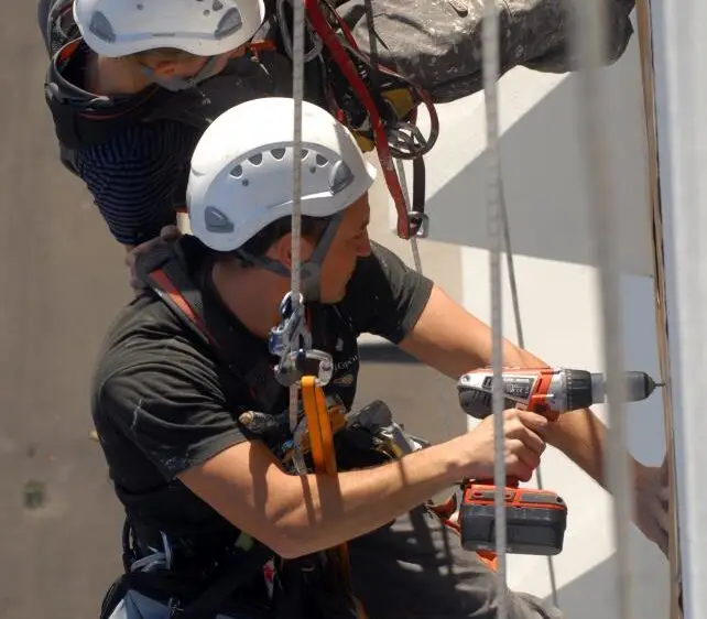 2 techniciens cordistes réalisant la pose d’une enseigne en hauteur à la Carsat.