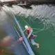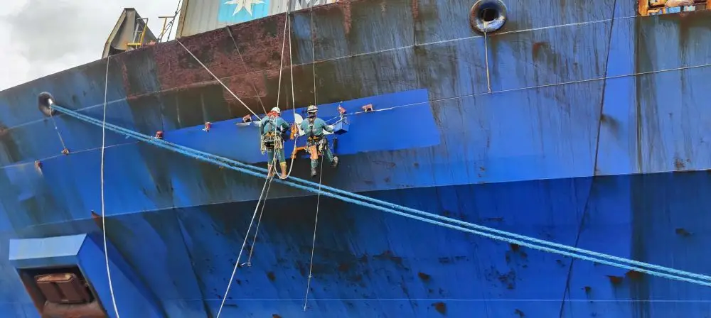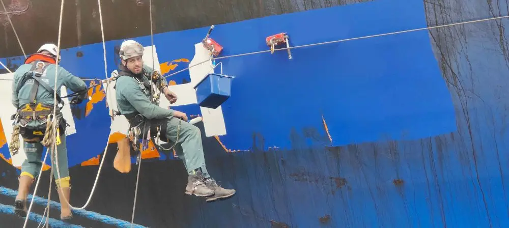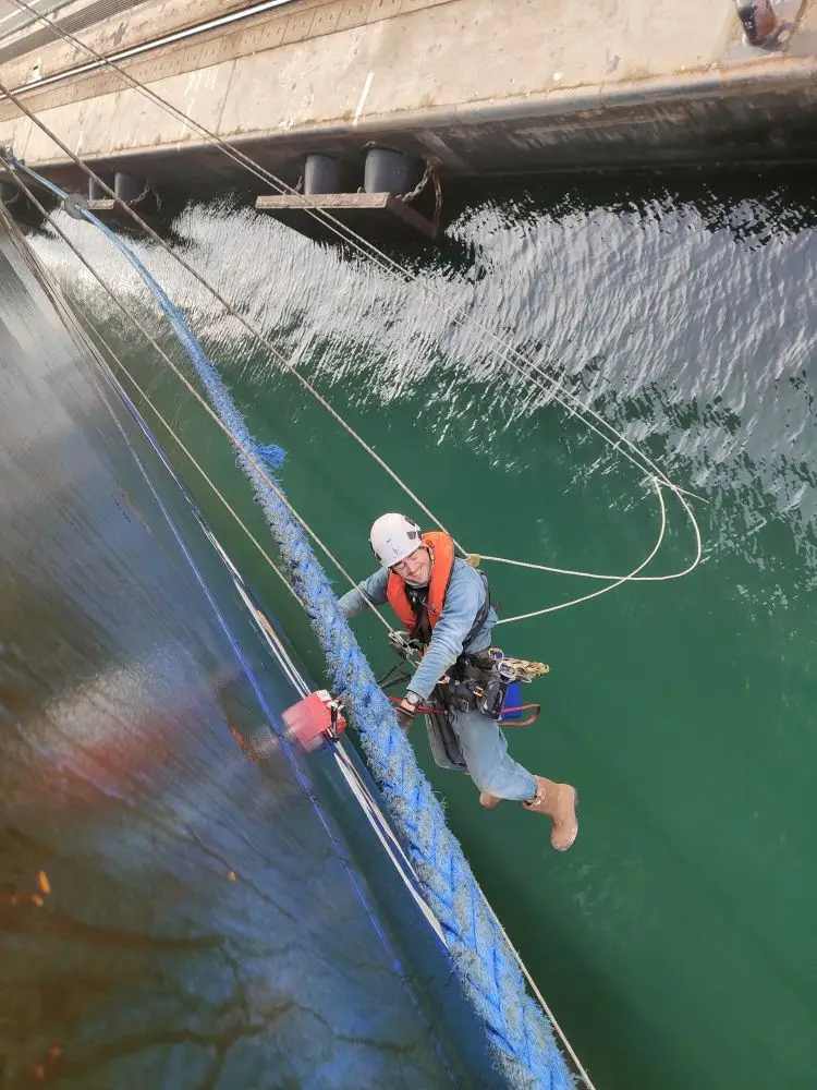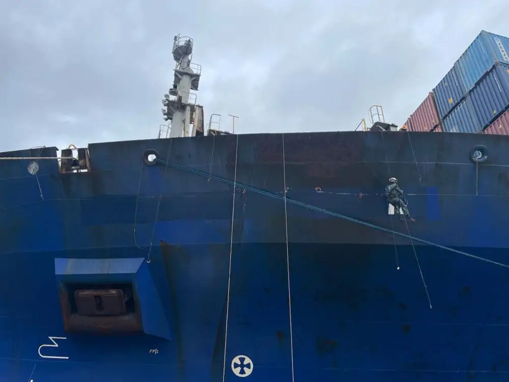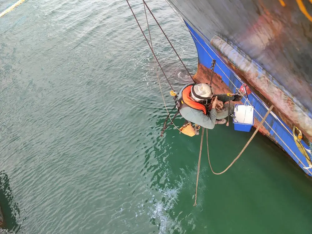 La mise en place d’une ligne de vie sur aimants était indispensable afin de se rapprocher de la coque du navire dû à un devers important.