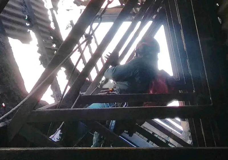 Intervention acrobatique pour notre équipe de techniciens cordistes de Marseille lors de la réalisation de travaux de mise en sécurité de tôles dans un aérateur en industrie.